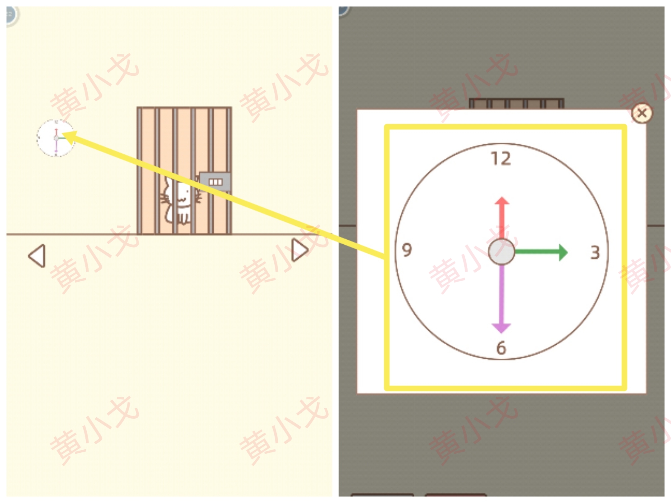 3.(場景1)點擊鐵板上的密碼鎖,根據上面的提示(綠紫紅紅),結合時鐘上的線索(紅-12、綠-3、紫-6),輸入密碼:3612