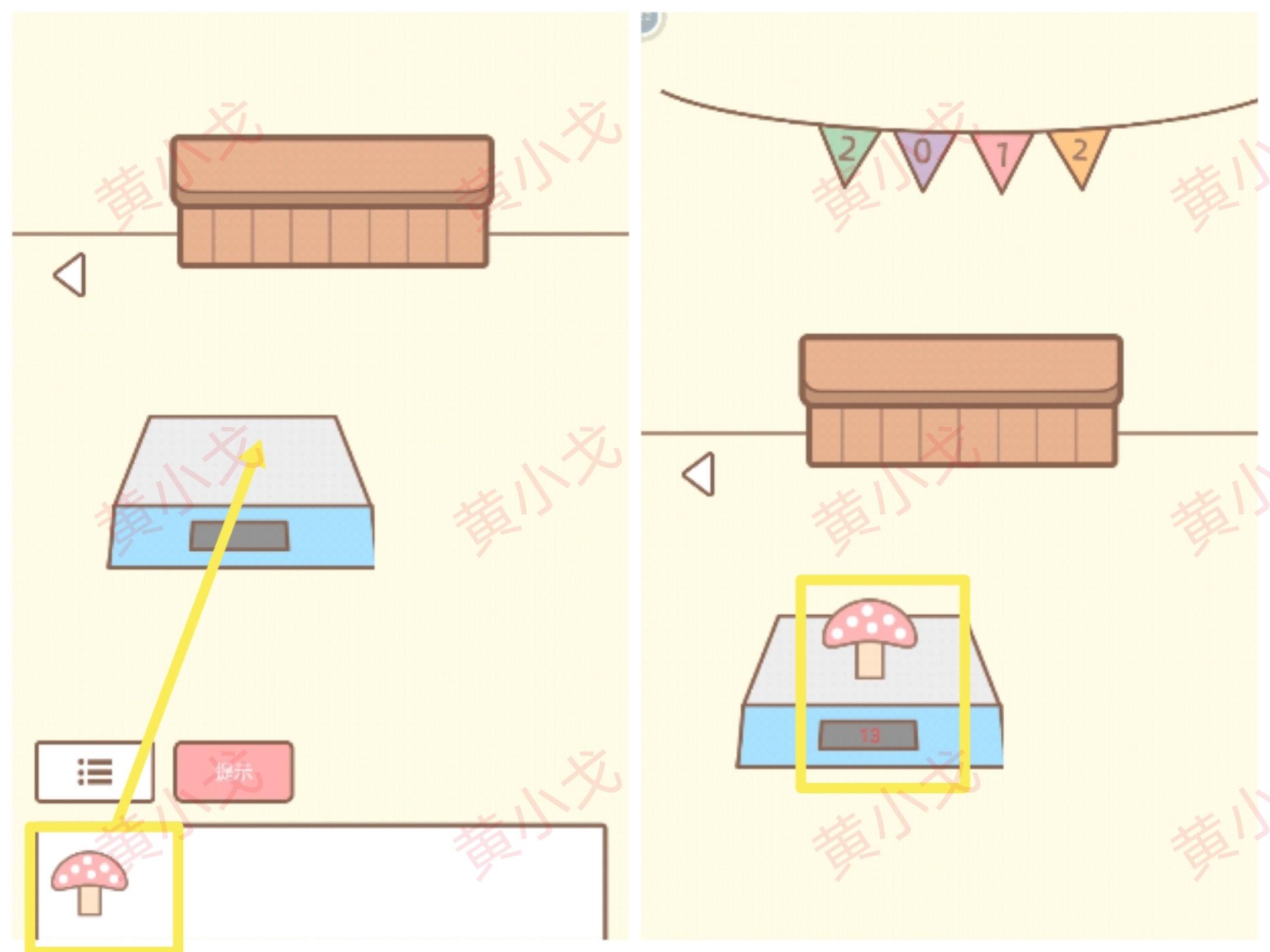 4.(中+右)把【綠蘑菇】、【紫蘑菇】和【粉蘑菇】放到秤上秤,獲得線索(綠蘑菇-16、紫蘑菇-10、粉蘑菇-13)
